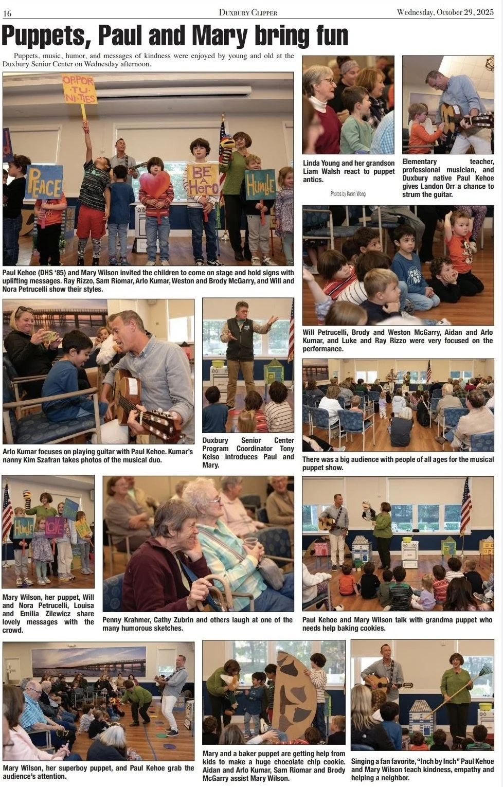 Back to All Events Intergenerational Show: Puppets, Paul & Mary Sing Songs by the Seashore Wednesday, February 18, 2026 2:00 PM 3:00 PM The Duxbury Senior Center 10 Mayflower Street Duxbury, MA, 02332 United States (map) Google Calendar ICS Join Puppets, Paul & Mary at Duxbury Senior Center for a musical and interactive puppet intergenerational variety show for all ages. Songs, stories, and audience participation will keep you entertained throughout the entire show! *Registration required, sign up at The CenterFunded by the Duxbury Cultural Council and Mass Cultural Council.